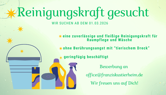 Das Franziskus Tierheim Hamburg sucht ab dem 01.04.2026 eine Reinigungskraft.
