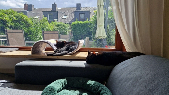 Die beiden haben sich sehr gut bei uns eingelebt und verbringen ihre Tage vor allem mit schlafen, kuscheln, Vögel beobachten und spielen. In den ersten Tagen haben sie ihr neues Zuhause erkundet. Luna war dabei deutlich mutiger. Choco hat sich einen neuen Raum erst angeschaut hat, wenn seine Schwester schon einmal durchgelaufen war. Waschmaschine, Fernseher und Staubsaugroboter wurden am Anfang sehr skeptisch begutachtet. Inzwischen haben sie sich aber dran gewöhnt. Beim Staubsaugroboter kann man auch super mit der sich drehenden Bürste spielen.