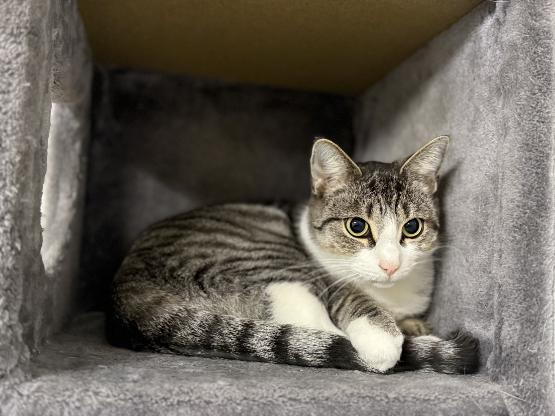 Lina ist eine charmante junge Katze mit einer feinen Mischung aus Neugier und Zurückhaltung.